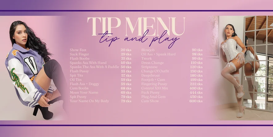 Ahegao, Azotes, Baile Erótico, Dirty Talk, Toples, Twerking, Yoga, Cameltoe, Fetichismo de Pies, Humillación, Juego de Roles, Juguetes Sexuales, Mamada, Masturbación con los Pechos, Estriptis, A Cuatro, Dedos, Dildo o Vibrador, Jerk-off Instruction, Garganta Profunda, Tacones, Show con Aceite, Masturbación, Juguetes para Pezones
